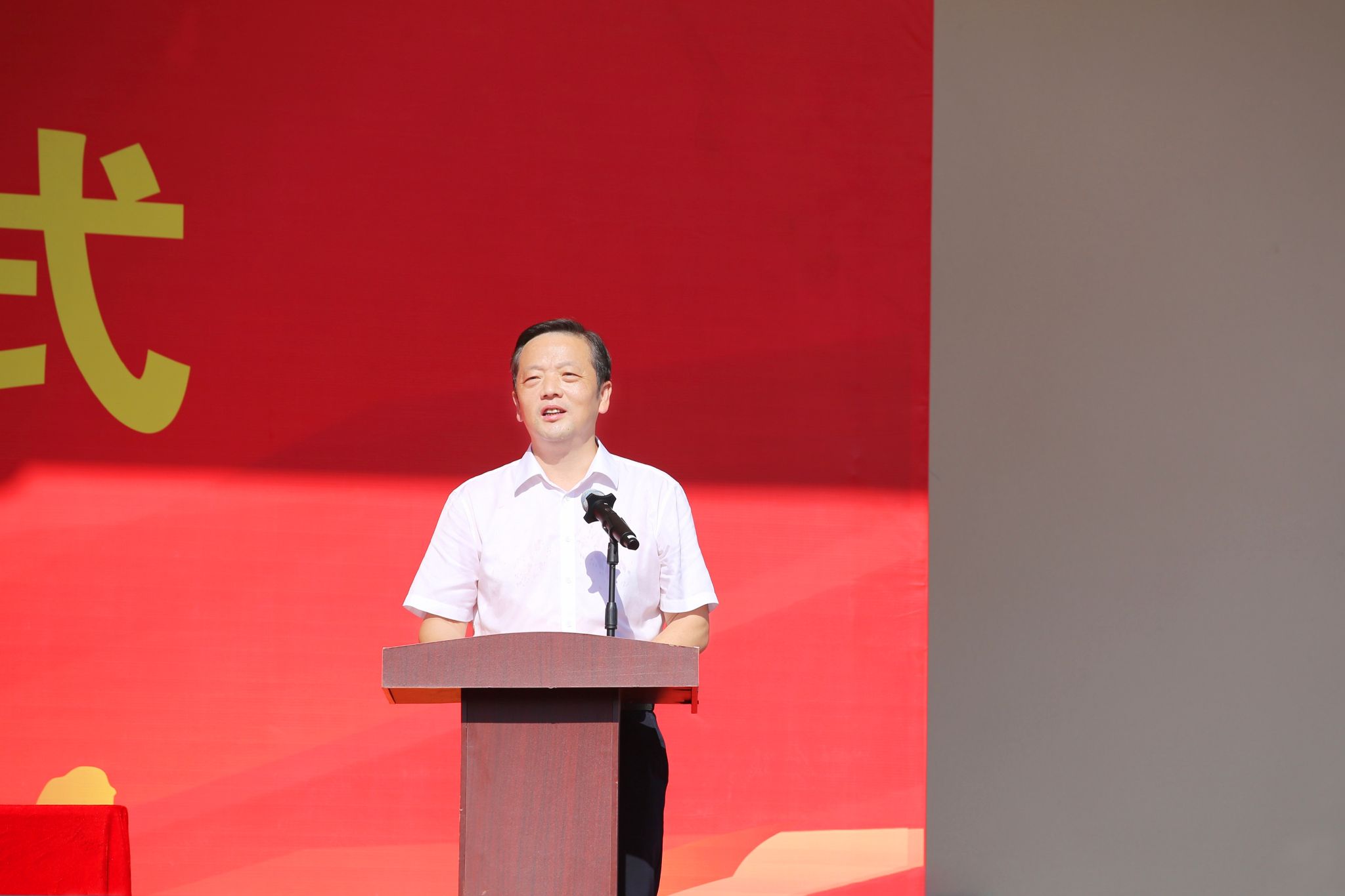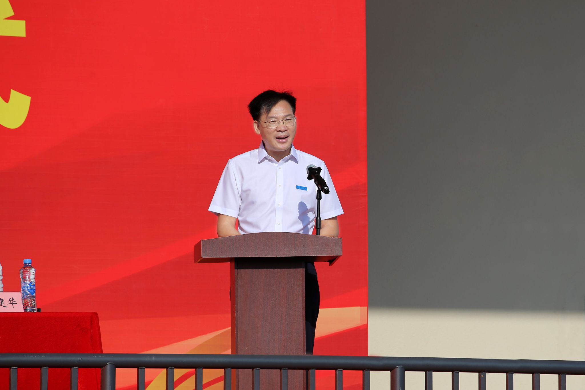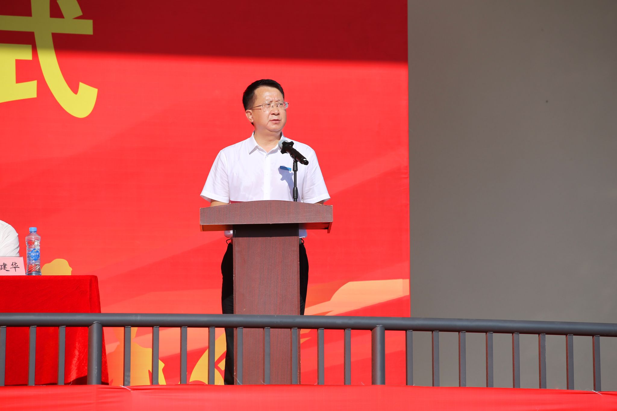 热血军训铸英姿,青春启航绘新篇。9月19日上午,江西电子信息职业技术学院万年产业学院2025年开学典礼暨军训开营仪式隆重举行。万年县委书记余华阳,县委副书记刘晓华,县委常委、人武部部长周军,县政府副县长胡洪贞,县教育体育局长叶建华,江西联晟电子有限公司副总经理郑元伟,学院党委书记肖红秋,党委委员、副院长陈嘉、钟端玮出席仪式,产业学院全体师生及军训教官参加典礼。仪式由钟端玮主持。