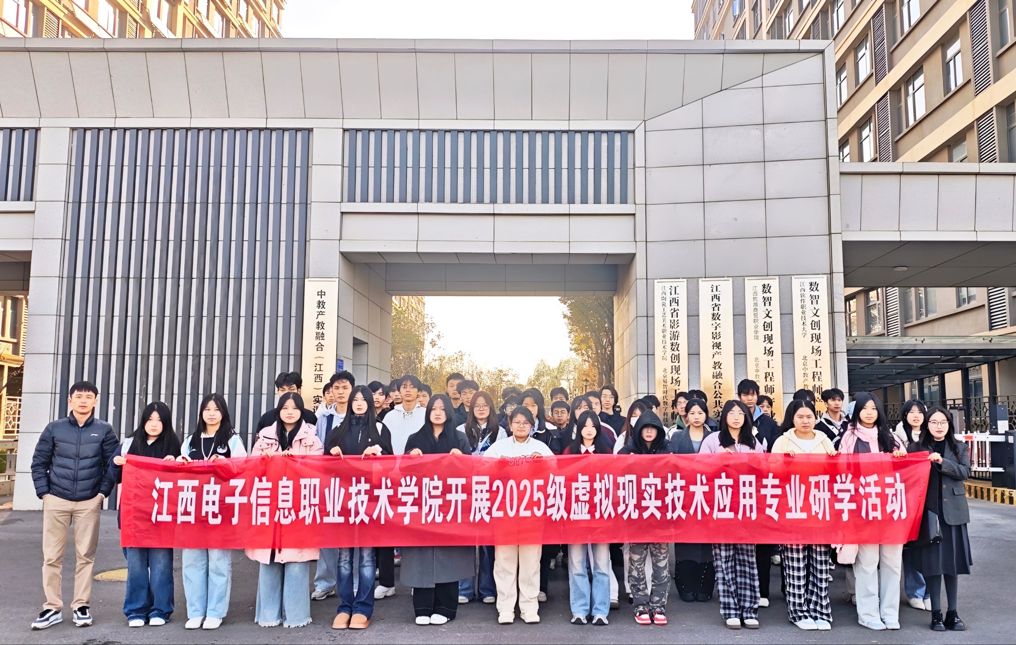 为深化产教融合、提升校企协同育人成效,并创新高素质技术技能人才培养模式,11月18日至28日,文化创意学院虚拟现实技术应用专业的7个班级,共计350余名师生,赴中教产教融合(江西)实训基地开展专题研学活动,让学子们能够沉浸式地感受职业教育的独特魅力及产业发展的前沿动态。